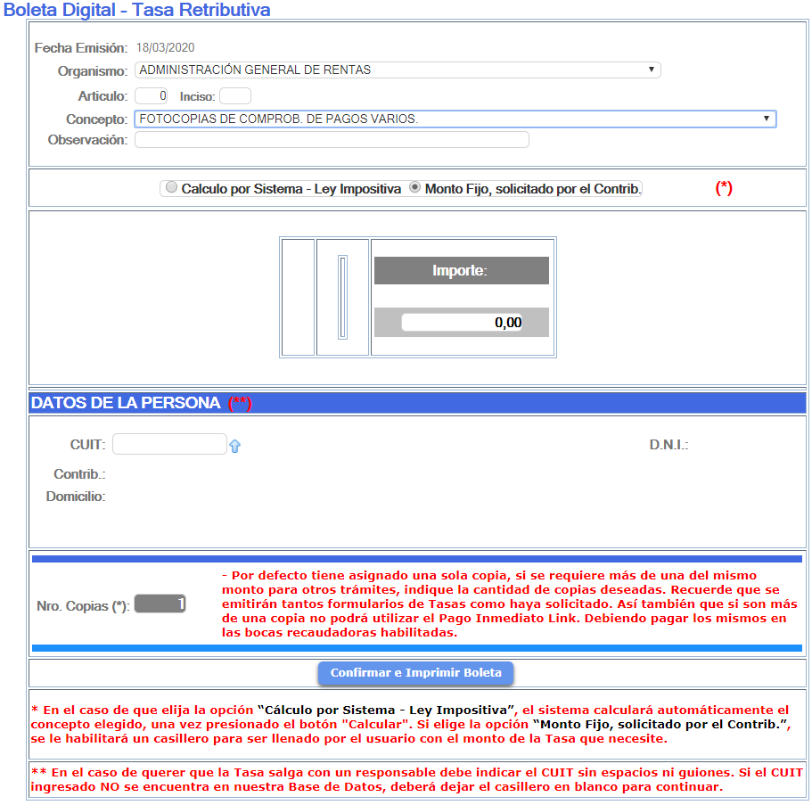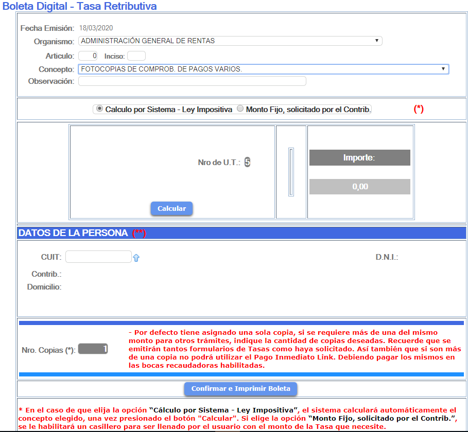 Al elegir la opción Cálculo por Sistema - Ley Impositiva el Nro. de U.T.: Las Unidades Tributarias se colocaran en forma automática según el concepto elegido y establecido por la nueva Ley Tributaria. Se puede dar el caso en el que el concepto cargue adicionales y/o cantidad de folios, se habilitara unos campos para cargar las cantidades, según correspondan.