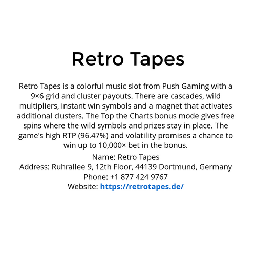 https://retrotapes.de/ Retro Tapes music slot by Push Gaming: cluster wins, cascades, multipliers, free spins, RTP 96.47%, up to 10,000× bet.