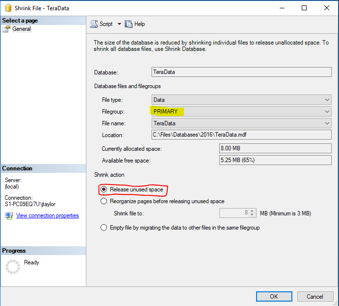 - Release unused space in PRIMARY filegroup