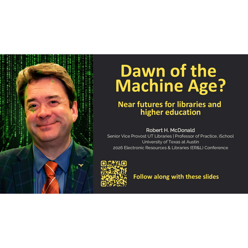 In his third keynote for Electronic Resources & Libraries, Robert H. McDonald reflects on ideas and predictions from his previous ER&L keynotes in 2006 and 2015, examining what was realized, what was missed, and what has returned with renewed urgency. He situates today’s conversations about generative artificial intelligence (GenAI), and the emerging prospect of artificial general intelligence (AGI), within more than two decades of technological anticipation in libraries and higher education. Participants will gain insight into post‑GenAI landscapes in research libraries and higher education, including implications for student success, online learning, and the long‑term sustainability of library principles in an AI‑shaped future.