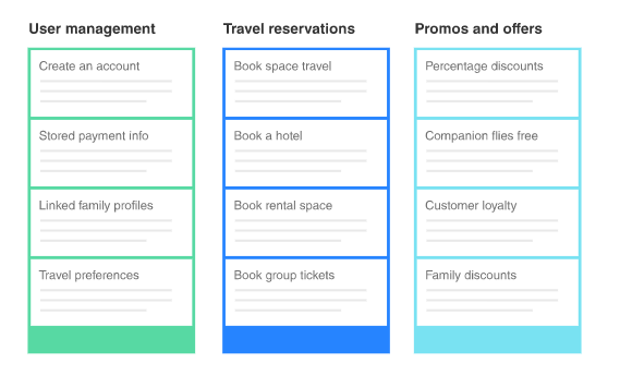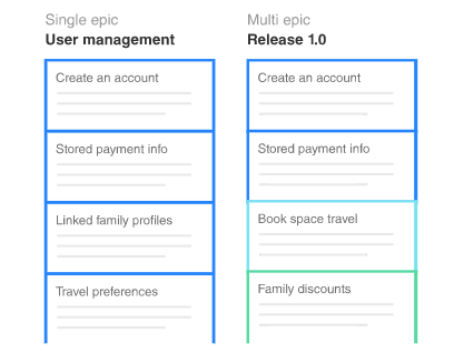 A continuación, el propietario del producto organiza las historias de usuario (Requisitos) en una única lista para el equipo de desarrollo. El propietario del producto puede optar por entregar primero un epic completo (Izquierda), puede que sea más importante para el programa reservar un vuelo barato que requiera historias de diversos epics (Derecha). A continuación, puedes ver ambos ejemplos.