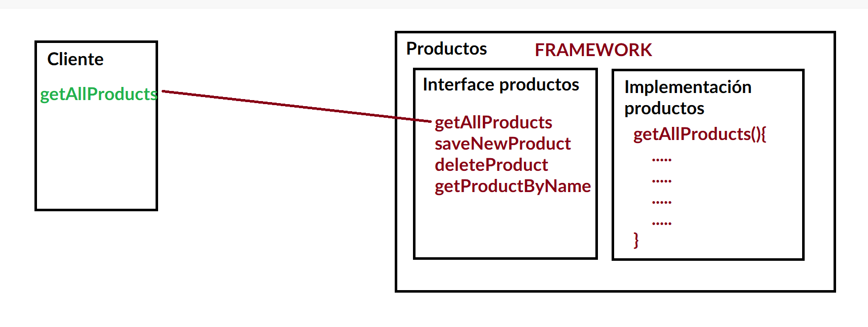 - Separación de interfaces e implementaciones: "Definir una interfaz pública (Contrato) conocida por el cliente que está separada de los detalles de como el componente funciona (Encapsulación y ocultamiento de información)"
