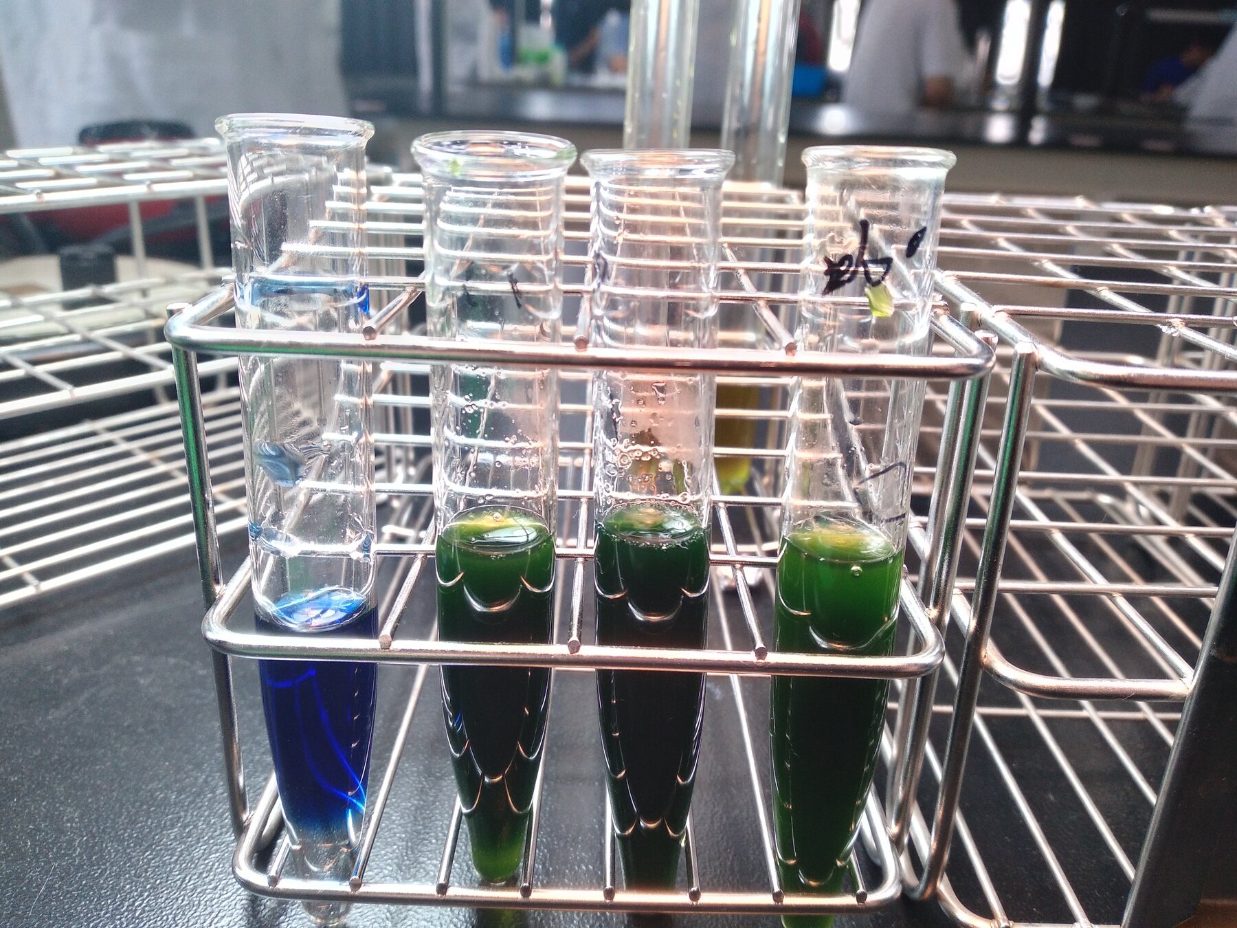 由左至右分別為 30°C純DCPIP、70°C、40°C、10°C 葉綠體懸浮液+DCPIP。右邊則是反過來。