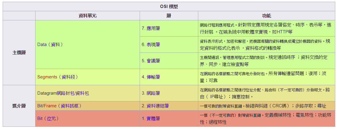 1983年國際標準組織(ISO International Organization for Standardization)提出並作為網路通訊的標準,共計有七層架構
