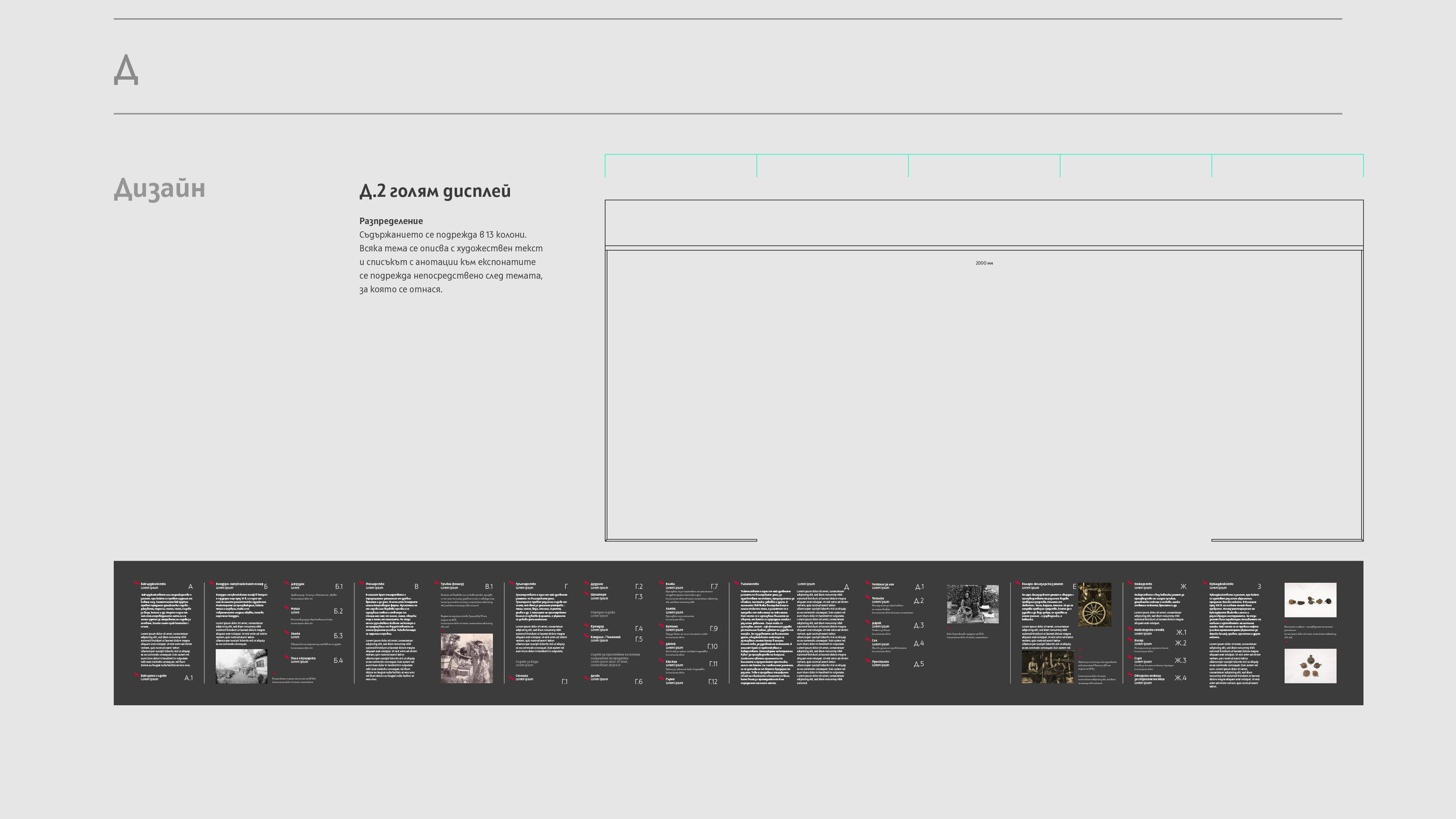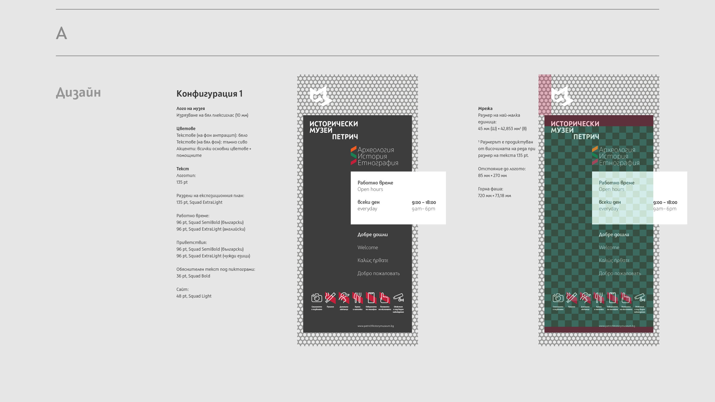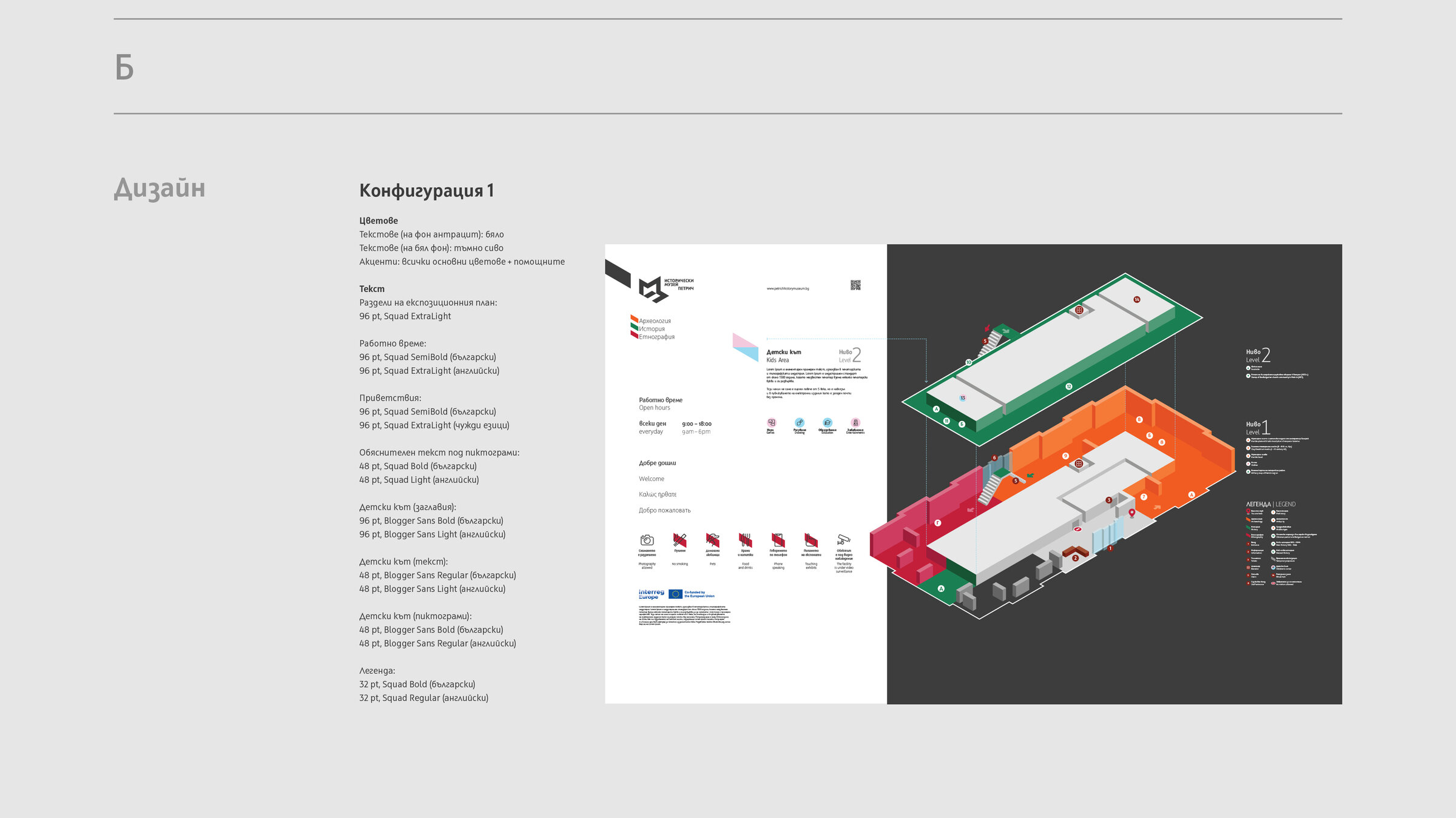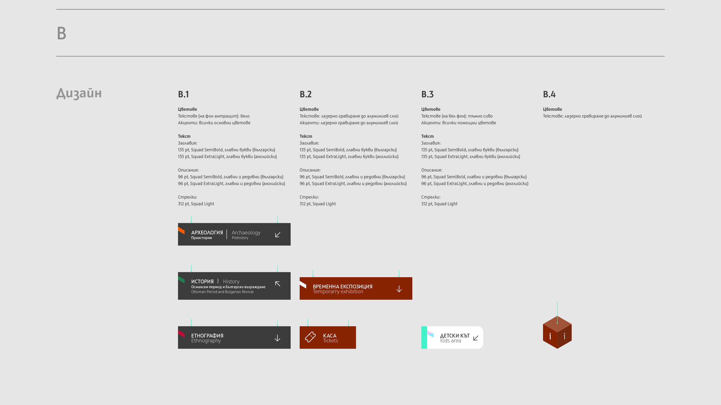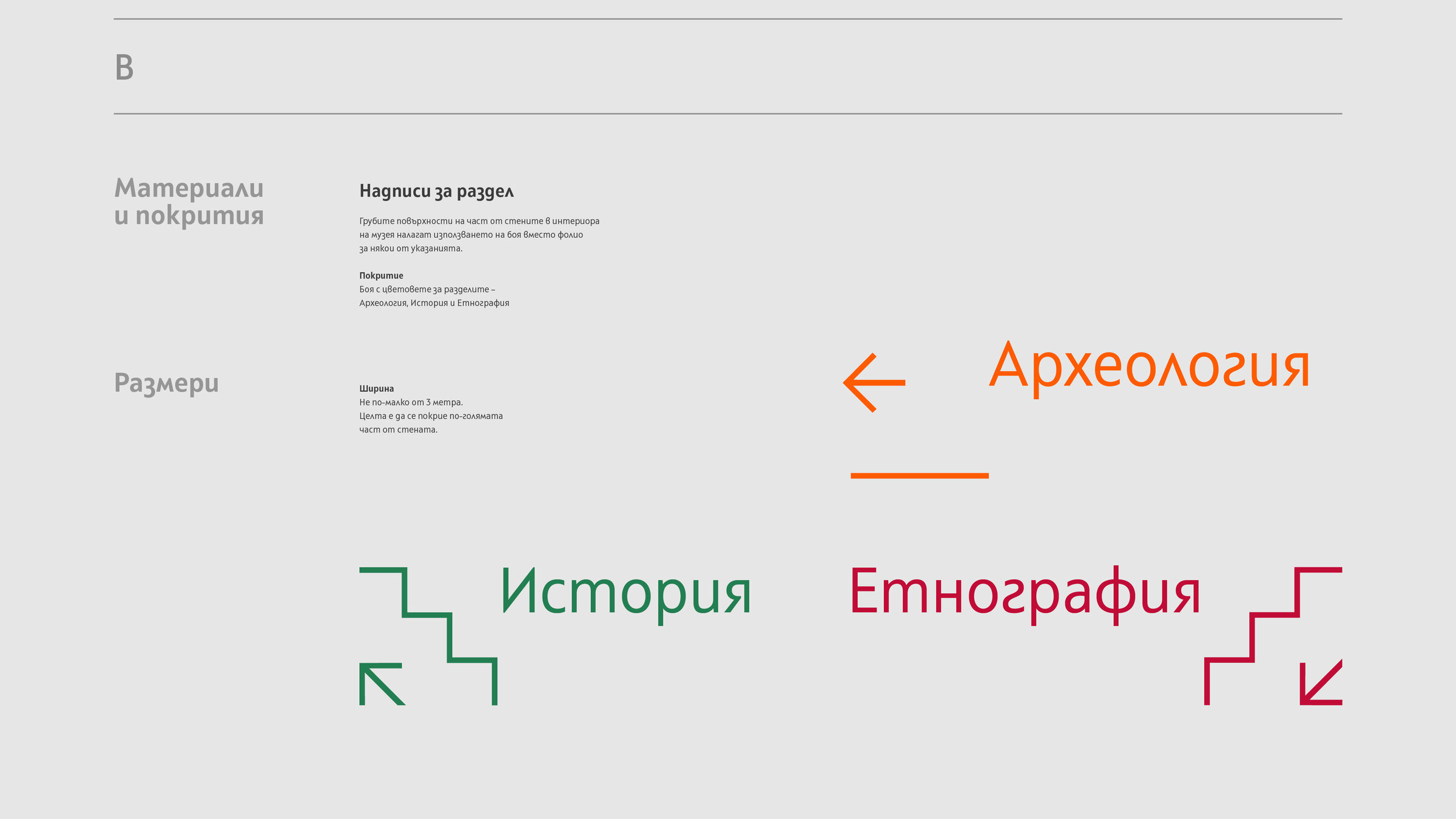 Стандарт за употреба на визуалните идентичност и комуникация на територията на музея. Съдържа цялостна графична концепция (определяне на стиловите изисквания към материалностите, типографията, цветовите решения, композициите).