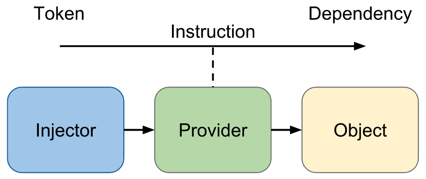 - Provider - A provider is like a recipe that tells the injector how to create an instance of a dependency. A provider takes a token and maps that to a factory function that creates an object.