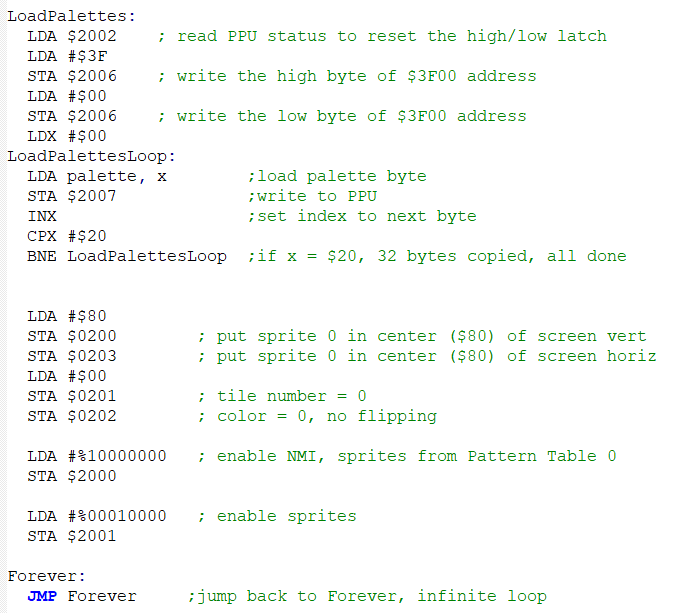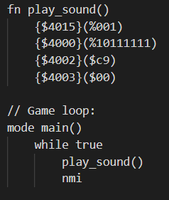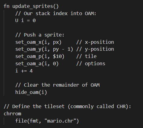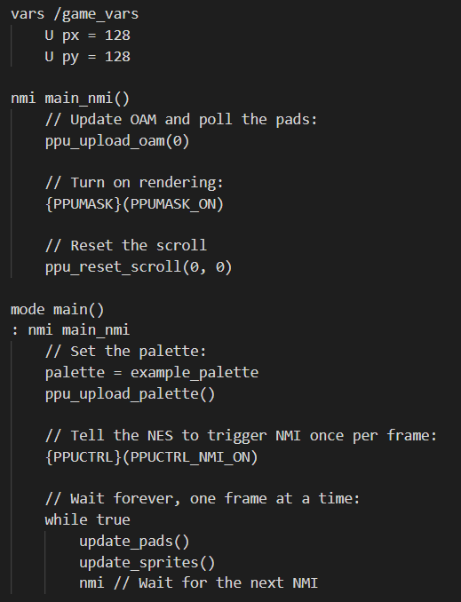 NESFab is a new programming language for creating NESÂ games. Designed with 8-bit limitations in mind, the language is more ergonomic to use than C, while also producing faster assembly code.