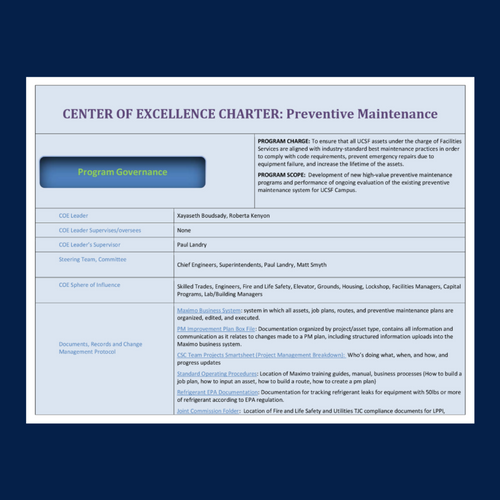 Center of Excellence for UCSF, Campus Life Services: Facilities Services, Preventative Maintenance Program