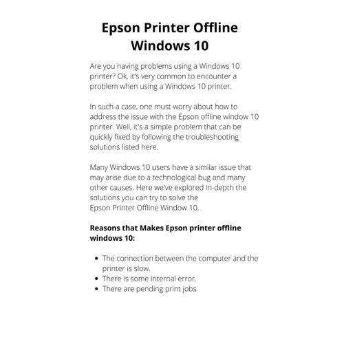 One of the more common problems faced by Epson printer users is the computer showing the Epson Printer Offline when it is actually on and ready to print. Most of the users at some point face ‘offline’ error while using a printer. In this writeup, we have addressed the issue of ‘Why Epson Printer is Offline’. We have further explained the solutions to these offline problems in a very simplified way. it generally indicates it cannot communicate with the computer. If you are facing a similar problem with your Epson printer, here are some quick solutions to resolve the issue. That Why I write best solution of Epson Printer Offline Windows 10. Content Source : https://www.printererrorsupport.com/blog/fix-epson-printer-offline-problem-windows-10/