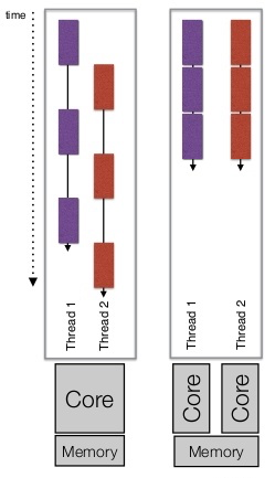 two or more tasks can start, run, and complete in overlapping time periods. It doesn't rule out that the tasks can be both be running at the same instant. For example, multitasking on a single- vs multi-core machine.