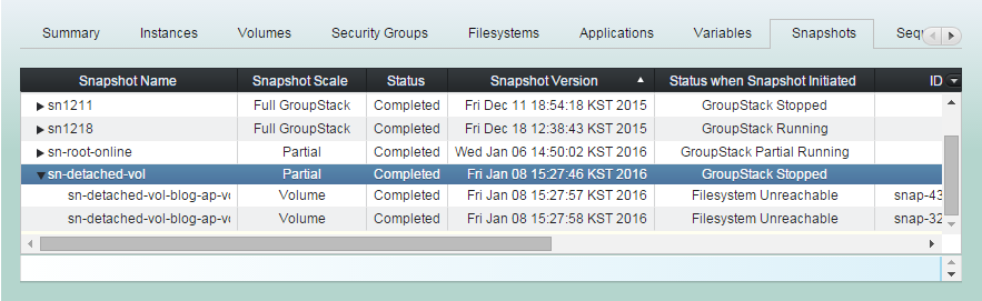 (1) Click "Volumes" tab in groupstack sub table view. And select detached (available) volumes you want to snapshot.