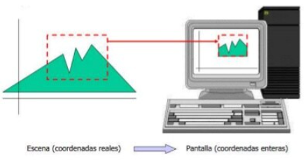 Un área rectangular que se especifica en coordenadas mundiales se denomina ventana. El área rectangular en el dispositivo de despliegue en el cual se coloca la ventana se llama puerta de visión