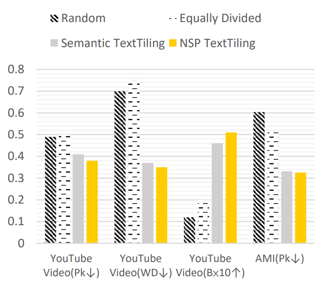資料集:相較目前(2023年8月)常用的口語化文本分割資料集AMI僅含有約100小時的轉錄文字,相較目前常用的書面文本分割資料集Wiki-727k擁有約727k篇英語維基百科頁面,其多樣性與資料量皆不足以支撐書面文本分割常用的監督式學習方法。