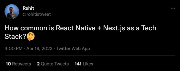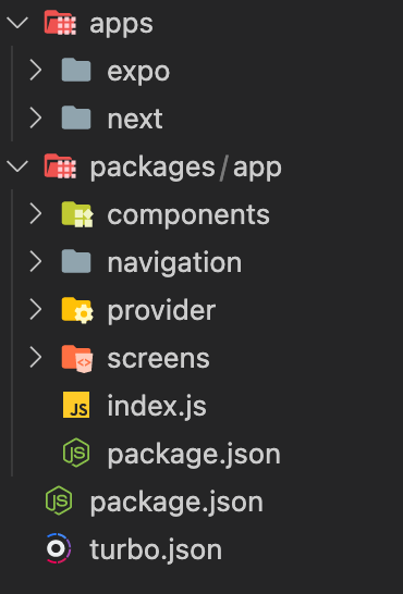 apps |- expo |- next | packages |- app |- components |- navigation |- provider |- screens |- index.js