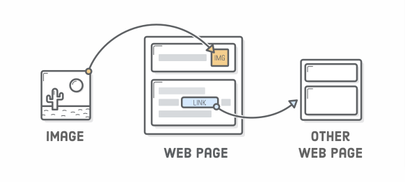 - Links point the user to a different HTML document, and images pull another resource into the page.