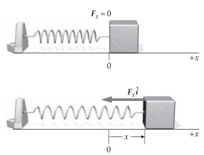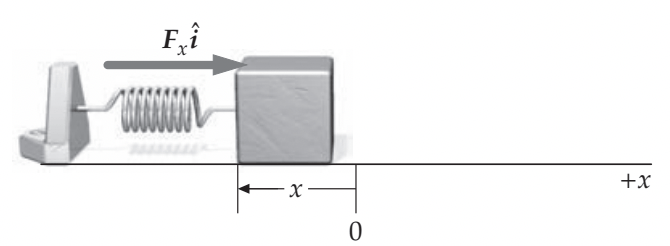 O gráfico mostra o componente \(x\) do deslocamento da extremidade livre da mola de sua posição relaxada em \(x_0\) versus a força aplicada à mola.