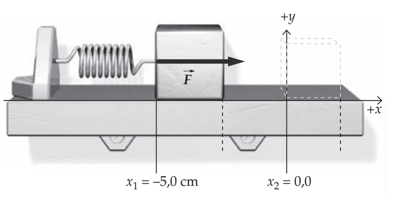 Um bloco de 4,0 kg está sobre uma mesa sem atrito e preso a uma mola horizontal com k 400 N/m. A mola é inicialmente comprimida de 5,0 cm. Encontre (a) o trabalho realizado sobre o bloco pela mola enquanto o bloco se move de \(x_1 =-5,0\) cm até sua posição de equilíbrio \(x_2 = 0\) cm, e (b) a rapidez do bloco em \(x_2\).