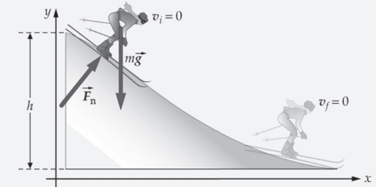 Você e uma amiga estão em uma estação de esqui que tem duas pistas, a pista para iniciantes e a pista para veteranos. As duas pistas começam no topo da colina e terminam na base da colina. Seja h a descida vertical para as duas pistas. A pista para iniciantes é mais longa e menos íngreme do que a pista para veteranos. Você e sua amiga, que é muito melhor esquiadora do que você, estão testando esquis experimentais sem atrito. Para tornar as coisas interessantes, você propõe a ela uma aposta: que se ela tomar a pista de veteranos e você tomar a pista de iniciantes, a rapidez dela ao final não será maior do que a sua. Não se dando conta de que você é um estudante de física, ela aceita a aposta. As condições são que vocês dois partam do repouso no topo da colina, deixando que os esquis deslizem sem outra interferência. Quem vence a aposta?