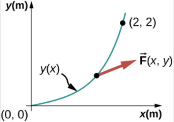 Um objeto move-se ao longo de uma trajetória parabólica de trajetória \(y = 0,5 x^2\), onde \(x\) e \(y\) estão em metros. A origem está em \((x,y)=(0,0)\) m. O ponto final está em \(x,y)=(2,2) \) m. O objeto move-se sob ação de uma força \(\vec F(x,y) = 5,0 y \hat i + 10 x \hat j\), onde a força está em newtons. Calcule o trabalho realizado pela força.