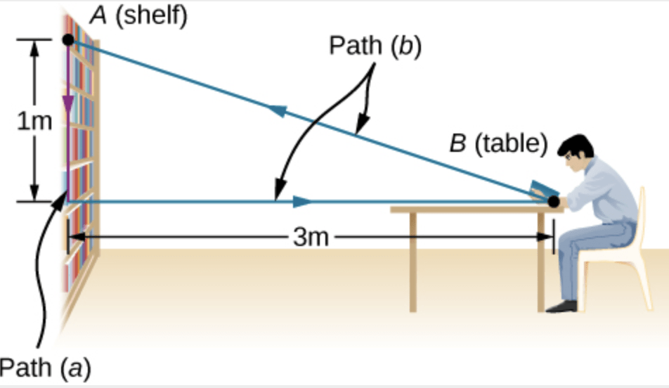 Você move um livro de biblioteca grande, pesando 20 N, cerca 1 m verticalmente para baixo de uma prateleira, e o carrega 3 m horizontalmente até uma mesa.