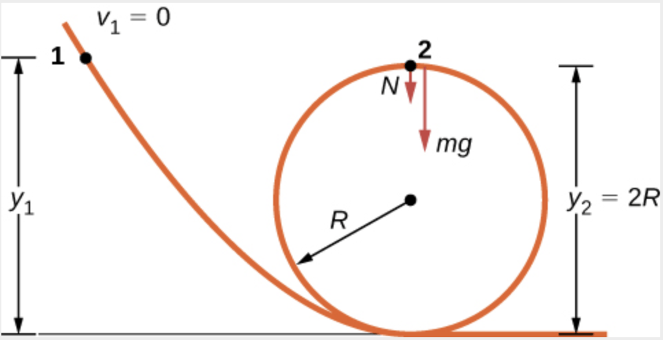 A pista sem atrito para um carro de brinquedo inclui um loop-the-loop de raio R. Quão alto, medido a partir da parte inferior do loop, o carro deve ser colocado para começar do repouso na seção de aproximação da pista e contornar todo o loop?