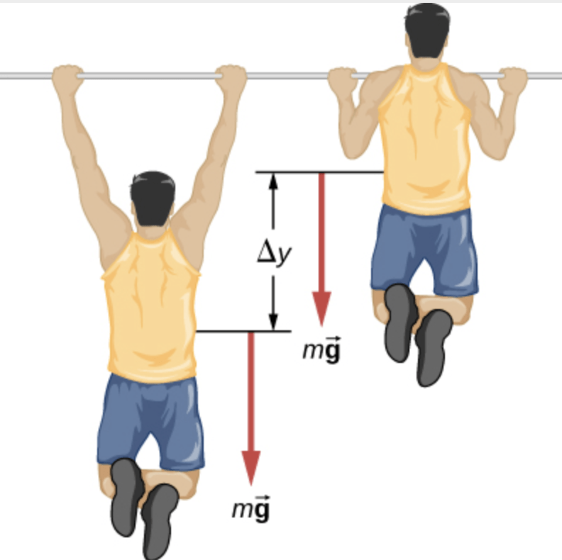 Um estagiário do exército de 80 kg faz flexões em uma barra horizontal (Figura). O estagiário leva 0,8 segundos para elevar o corpo de uma posição mais baixa para onde o queixo está acima da barra. Quanta força os músculos do estagiário fornecem movendo seu corpo da posição inferior para onde o queixo está acima da barra? (Dica: Faça estimativas razoáveis para quaisquer quantidades necessárias.)