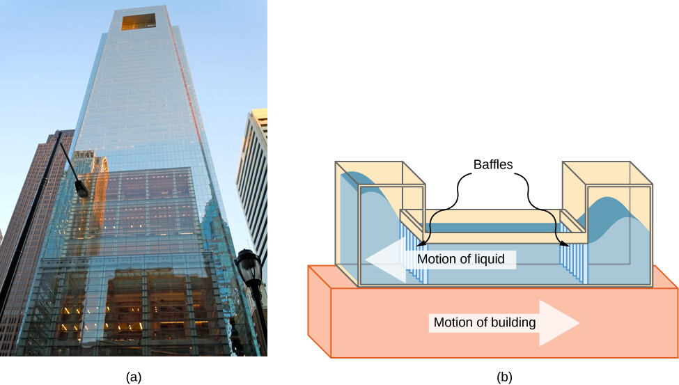 O Edifício Comcast na Filadélfia, Pensilvânia, que se ergue acima do horizonte, tem aproximadamente 305 metros de altura. Nessa altura, os andares superiores podem oscilar para frente e para trás devido à atividade sísmica e aos ventos flutuantes. Em Taiwan, o edifício Taipei se utiliza de uma esfera para controlar a oscilação.