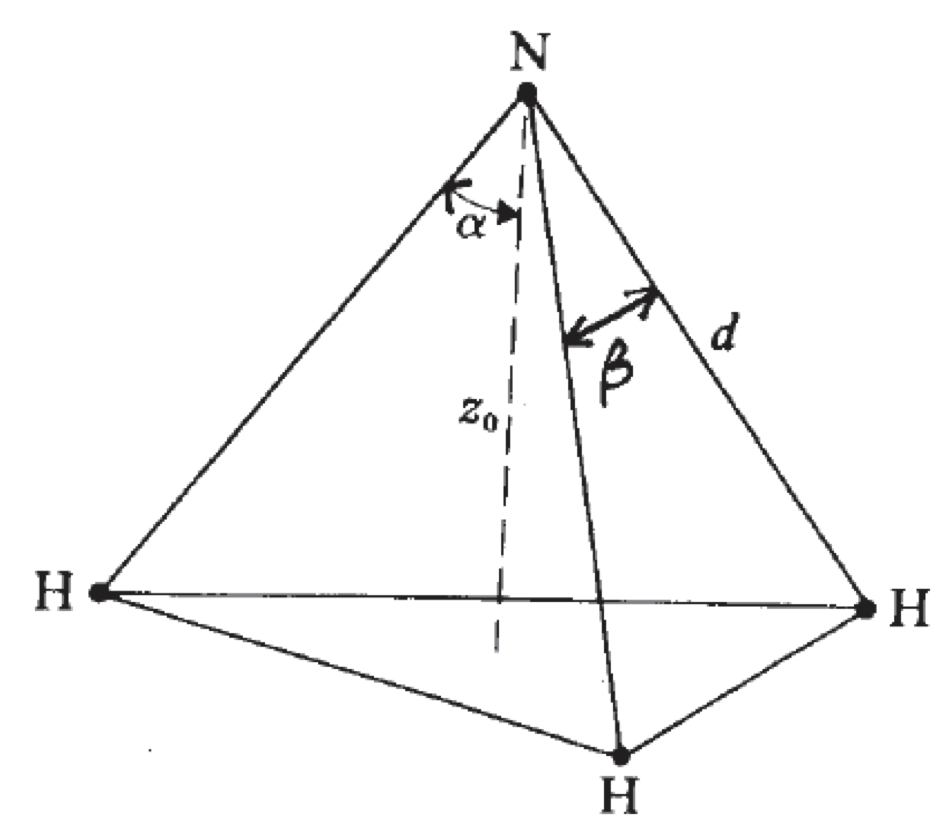 Existe uma posição simétrica, N', do átomo de nitrogênio que se encontra à mesma distância do plano H-H-H, mas no lado oposto (não mostrado).