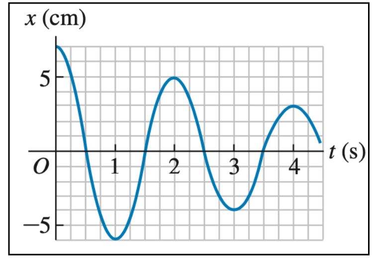 Uma massa está vibrando na extremidade de uma mola com constante de mola igual a 225 N/m. A figura mostra um gráfico de sua posição x(cm) em função do tempo t(s). Nos instantes t = 0 s, 1 s, 2 s, 3 s e 4 s, a massa está instantaneamente em repouso.