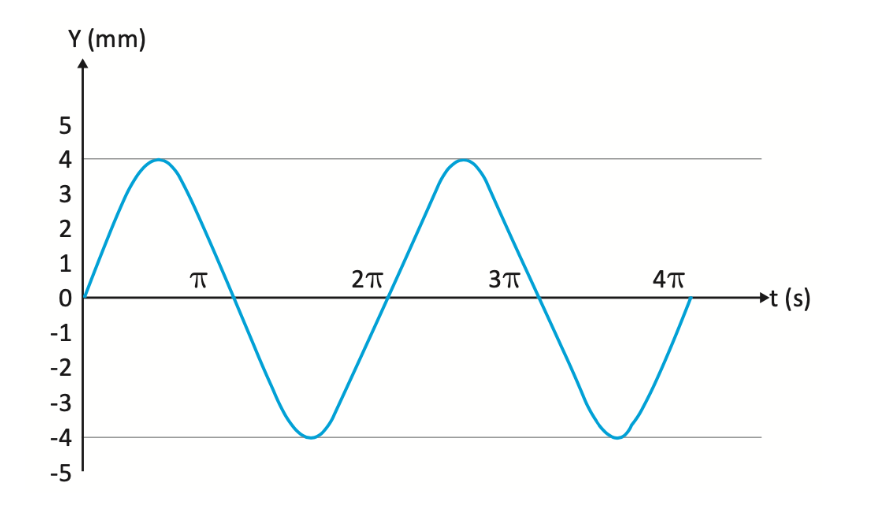 Considere que um mecanismo do tipo Scotch Yoke tenha sido utilizado em uma mesa de vibração em um processo industrial e que ensaios experimentais determinaram o gráfico do deslocamento do êmbolo do mencionado mecanismo, conforme mostra a figura a seguir.