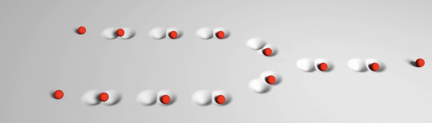 A animação mostra a manipulação de átomos de carbono em uma superfície de cobre.