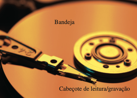 O cabeçote de leitura/gravação e a bandeja giratória no interior do disco rígido de um computador.