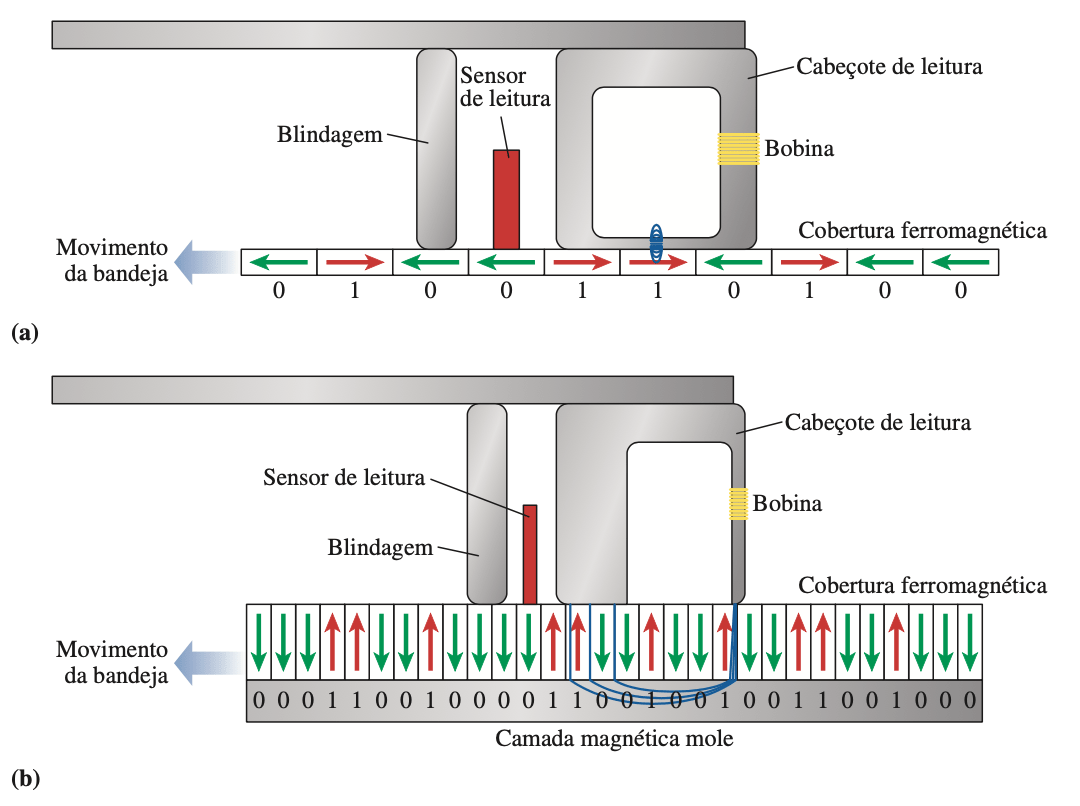 Enquanto a bandeja dotada de cobertura move-se abaixo do cabeçote de leitura/gravação, um pulso de corrente em um sentido magnetiza a superfície da bandeja, representando uma unidade binária, ou um pulso de corrente de sentido contrário magnetiza a superfície, representando um zero binário.