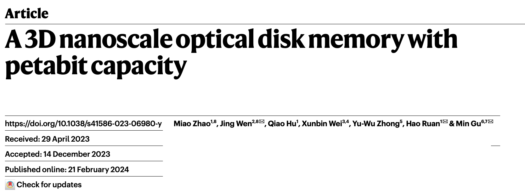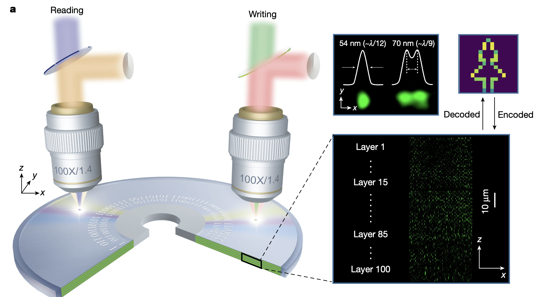 Pela primeira vez, os pesquisadores demonstraram que a capacidade de armazenamento óptico de dados pode atingir o nível de petabit (Pb) estendendo a arquitetura de gravação planar para três dimensões com centenas de camadas.