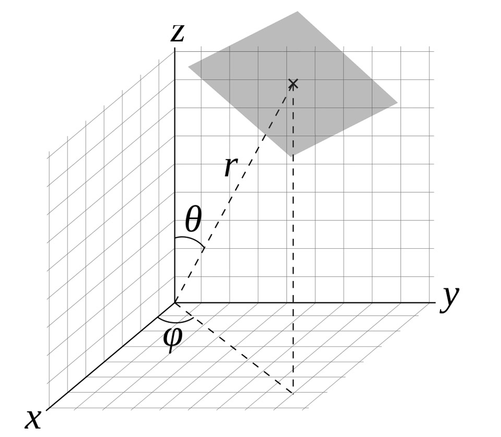 Em um sistema de coordenadas esféricas, um ponto é identificado por r, θ e φ.