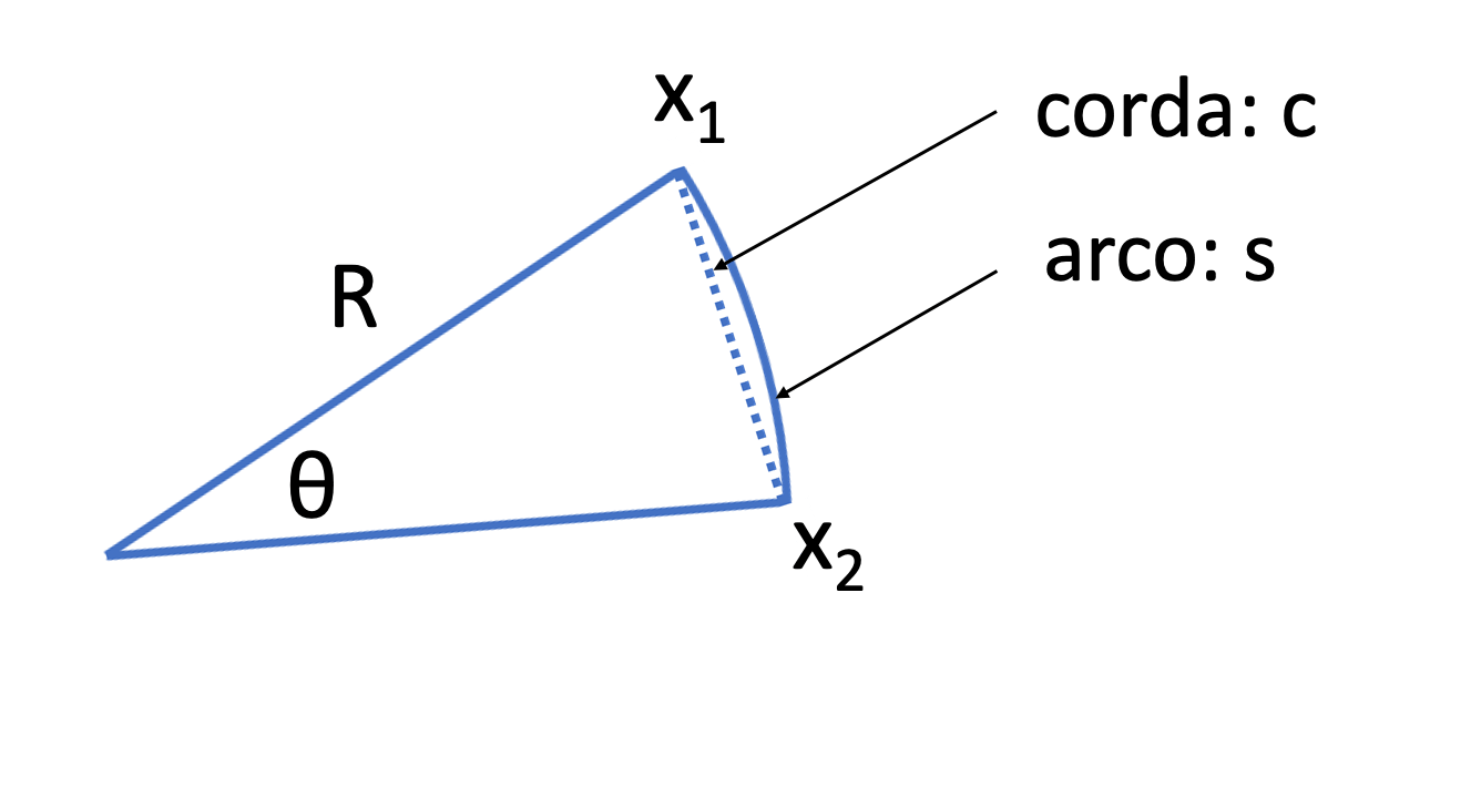 Então, a corda \( c = 2R\sin(\theta/2) \approx R\theta = s\).