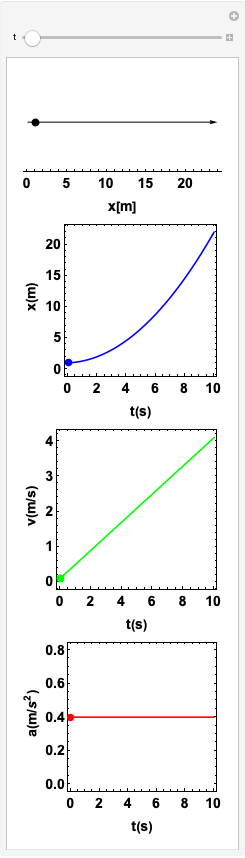 Posição em função do tempo; Velocidade em função do tempo; Aceleração em função do tempo.