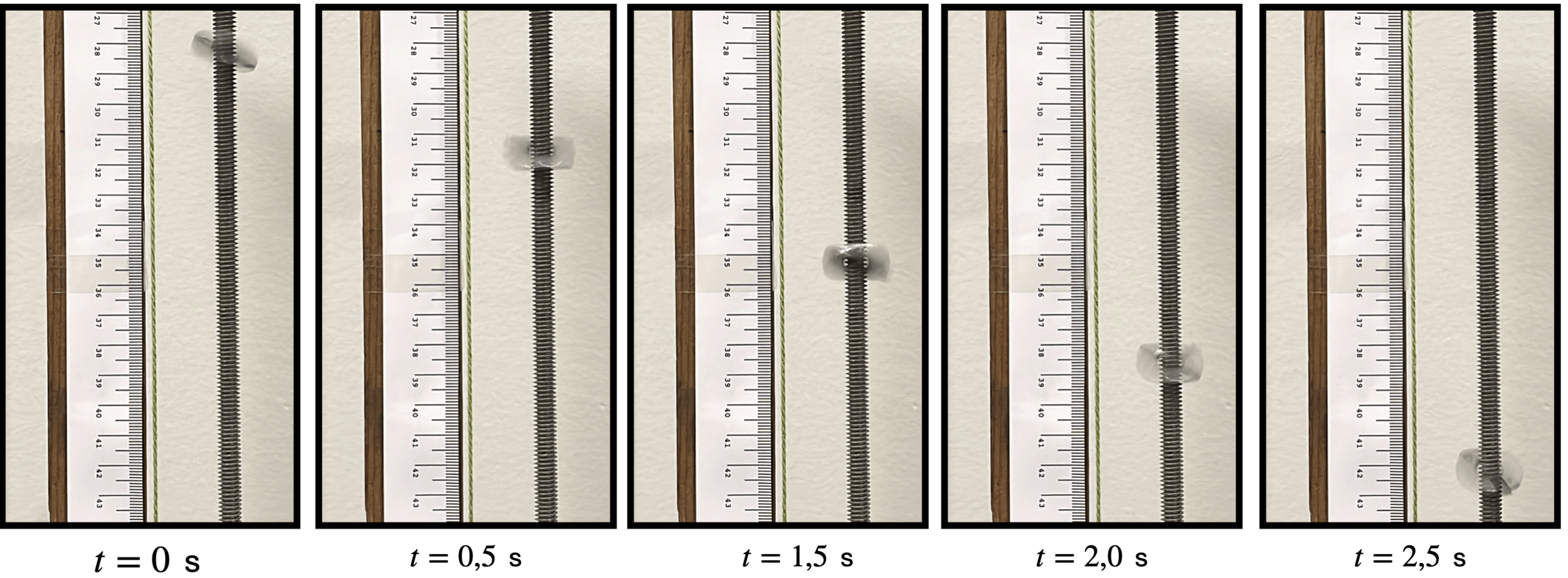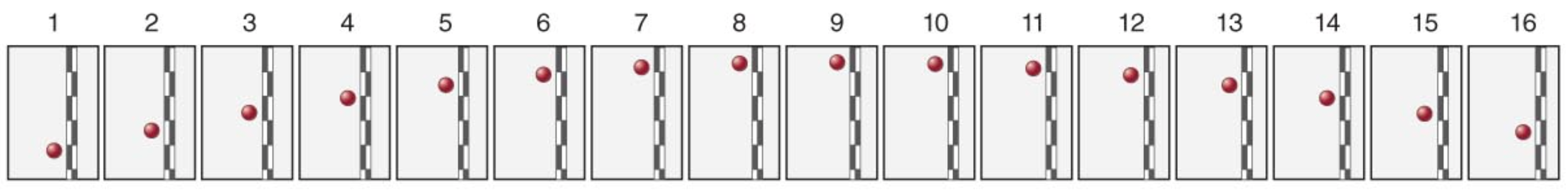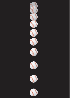 Imagem com vários instantâneos de uma bola caindo. O intervalo de tempo entre as imagens sucessivas é de 0,1 s.