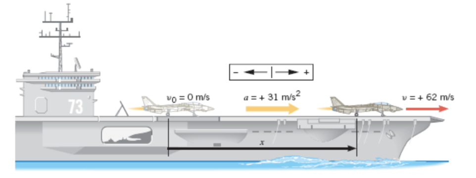 Um jato está decolando do convés de um porta-aviões, como mostrado na figura. Partindo do repouso, o jato é catapultado com uma aceleração constante de +31 m/s\(^2\) ao longo de uma reta e alcança uma velocidade de +62 m/s. Determine o deslocamento do jato.