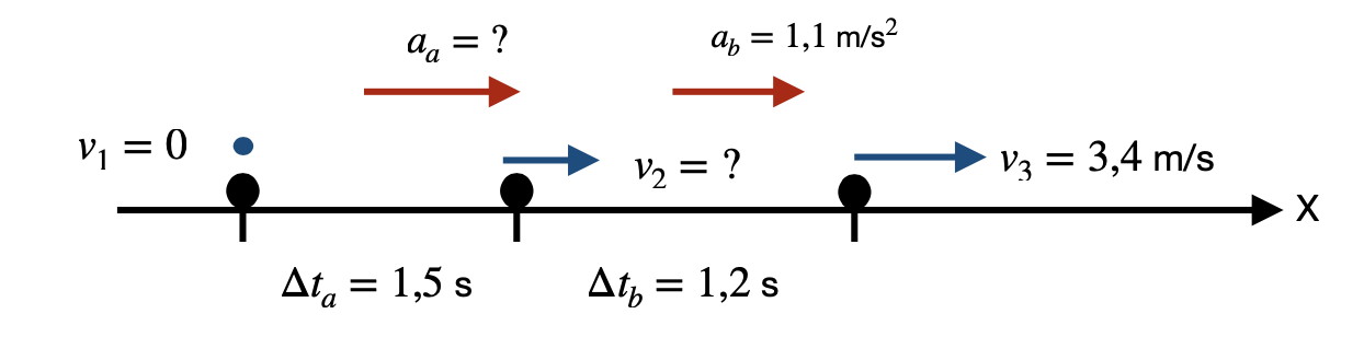 Um jogador de futebol, partindo do repouso na linha de encontro com os adversários, acelera em linha reta durante um intervalo de tempo de 1,5 s. Depois, durante um intervalo de tempo desprezível, ele varia o módulo da sua aceleração até um valor de 1,1 m/s\(^2\). Com esta aceleração, ele continua na mesma direção e no mesmo sentido por mais 1,2 s, até alcançar uma velocidade de 3,4 m/s. Qual o valor da sua aceleração (considerada como constante) durante o período inicial de 1,5 s? C2.88 / A3.P1-02
