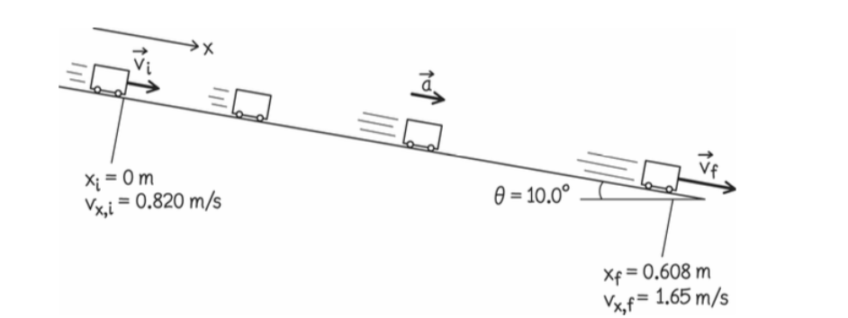 Em uma universidade, em um exercício de laboratório, os alunos medem o ângulo de inclinação θ de um plano de baixo atrito, as rapidezes inicial e final (diferente de zero) de um carrinho à medida que desce entre duas posições no trilho e a distância entre essas duas posições. Para um ângulo de inclinação de 10,0°, um grupo obtém os valores \(v_i\) = 0,820 m/s e \(v_f\) = 1,65 m/s para uma distância de 0,608 m. Com base nesses dados, que valor esses alunos obtêm para g ?