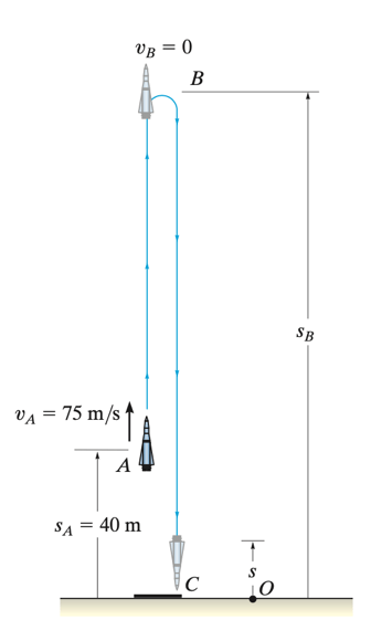 Durante um teste, um foguete move-se para cima a 75 m/s e, quando ele está a 40 m do solo, seu motor falha. Determine (a) a altura máxima sB alcançada pelo foguete e sua (b) velocidade um instante antes de ele bater no solo. Em movimento, o foguete está sujeito a uma aceleração para baixo constante de 9,81 m/s\(^2\), decorrente da gravidade. Despreze o efeito da resistência do ar.