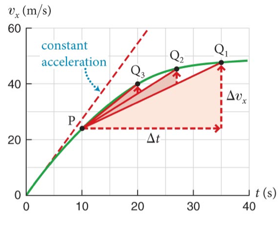 As acelerações médias: \(a_1,a_2,a_3\) são diferentes porque as inclinações da reta secante são diferentes.