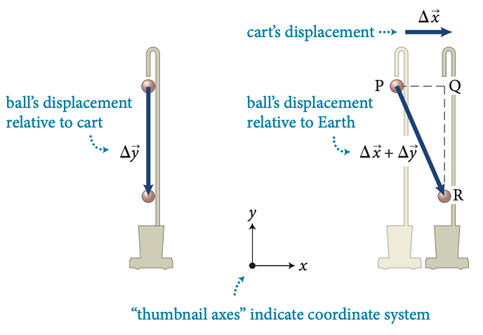 Vejamos, primeiramente as coordenadas da bolinha no referencial da Terra em dois instantes de tempo distintos.