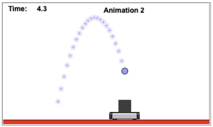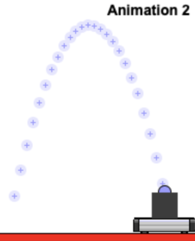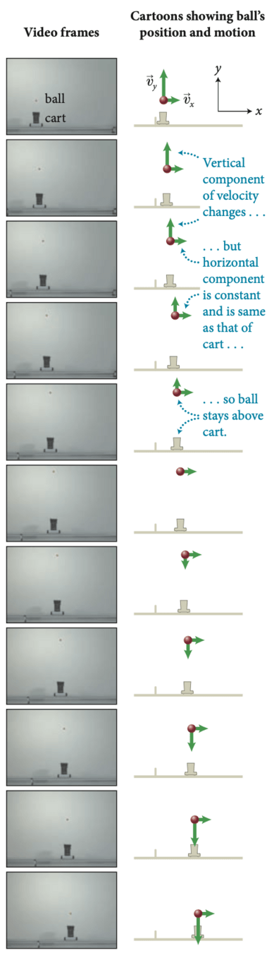 Considere o movimento de uma bola lançada do topo de um canhão anexado a um carrinho que se move a velocidade constante ao longo de uma pista horizontal: