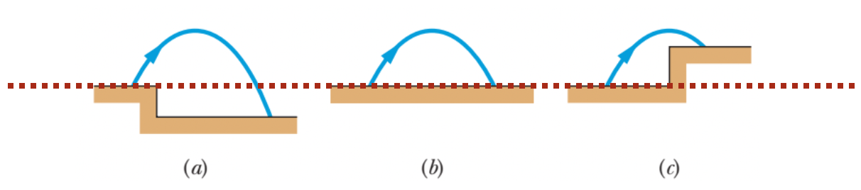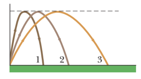 A figura mostra três situações nas quais projéteis iguais são lançados do solo (a partir do mesmo nível) com a mesma velocidade escalar e o mesmo ângulo. Entretanto, os projéteis não caem no mesmo terreno. Ordene as situações de acordo com a velocidade escalar final dos projéteis imediatamente antes de aterrissarem, começando pela maior.