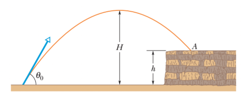 Na figura, uma pedra é lançada no alto de rochedo de altura h com uma velocidade inicial de 42,0 m/s e um ângulo \(\theta_0\) = 60,0° com a horizontal. A pedra cai em um ponto A, 5,50 s após o lançamento. Determine (a) a altura h do rochedo, (b) a velocidade da pedra imediatamente antes do impacto em A e (c) a máxima altura H alcançada acima do solo.