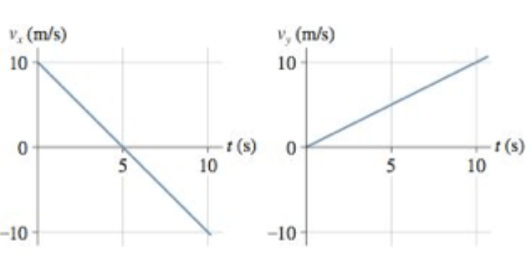 Um robô da lego é controlado remotamente sobre um piso horizontal onde o atrito é reduzido. A figura mostra os gráficos de \(v_x\) e \(v_y\), os componentes x e y da velocidade do disco. Ele parte da origem.