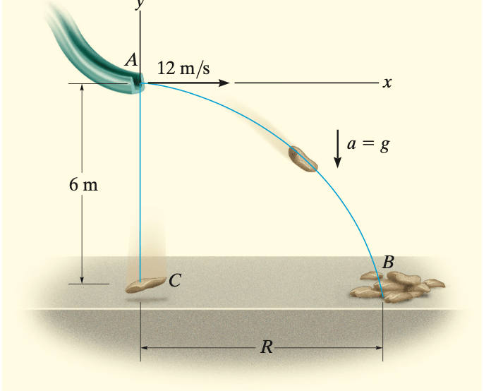 Um saco desliza da rampa, como mostrado na Figura, com uma velocidade horizontal de 12 m/s. Se a altura da rampa é de 6 m a partir do piso, determine o tempo necessário para o saco atingir o piso e a distância R até onde os sacos começam a se empilhar.