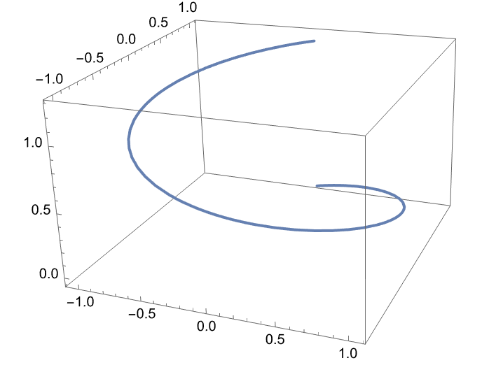 Uma trajetória helicoidal no espaço (\(x,y,z\)) olhando lateralmente.